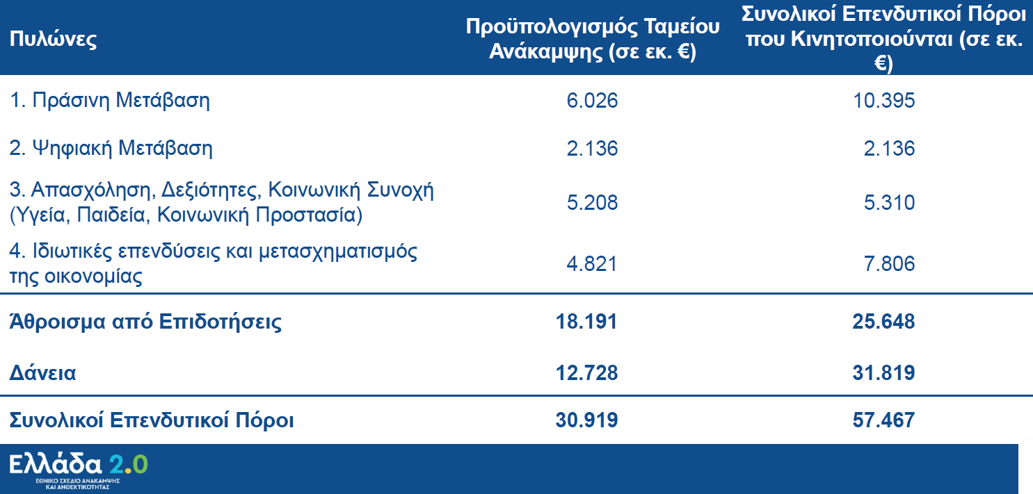 Το Σχέδιο Ανάκαμψης και Ανθεκτικότητας 2021-2026 έχει στόχο την ανάπτυξη και απασχόληση και αξιοποιεί τα 32 δισ. ευρώ που διατίθενται από το Ταμείο Ανάκαμψης και Ανθεκτικότητας, που πλέον ονομάζεται «Ελλάδα 2.0», και επιδιώκει την κινητοποίηση ιδιωτικών πόρων 25 δισ., φτάνοντας τα 57 δισ. ευρώ συνολικά.